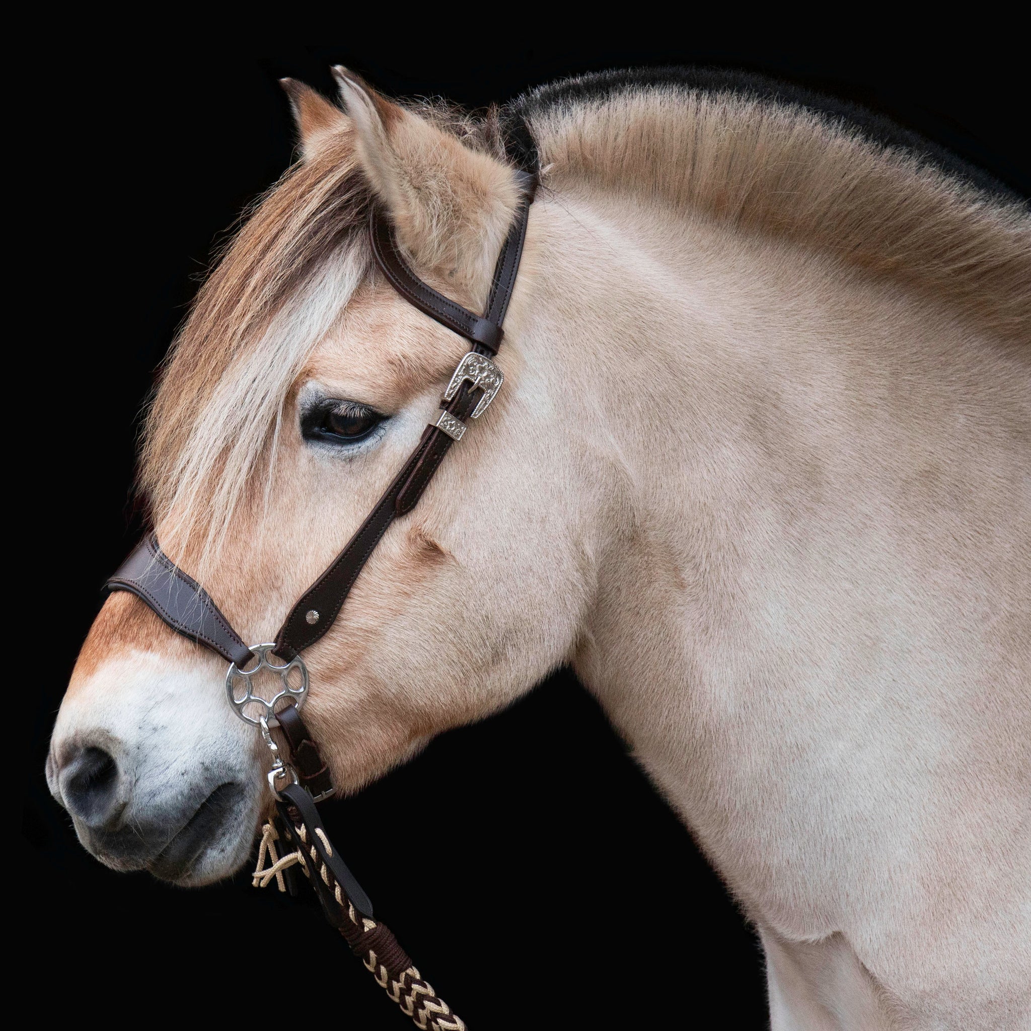 The integrated star-hackamore gives a slight leverage effect which distributes the pressure over the nose, chin and behind the ears. You can also use this one as a sidepull bridle by clipping the reins on a different place on the star wheel. If you want to read more about the hackamore and how this works, you might find this blogpost interesting.