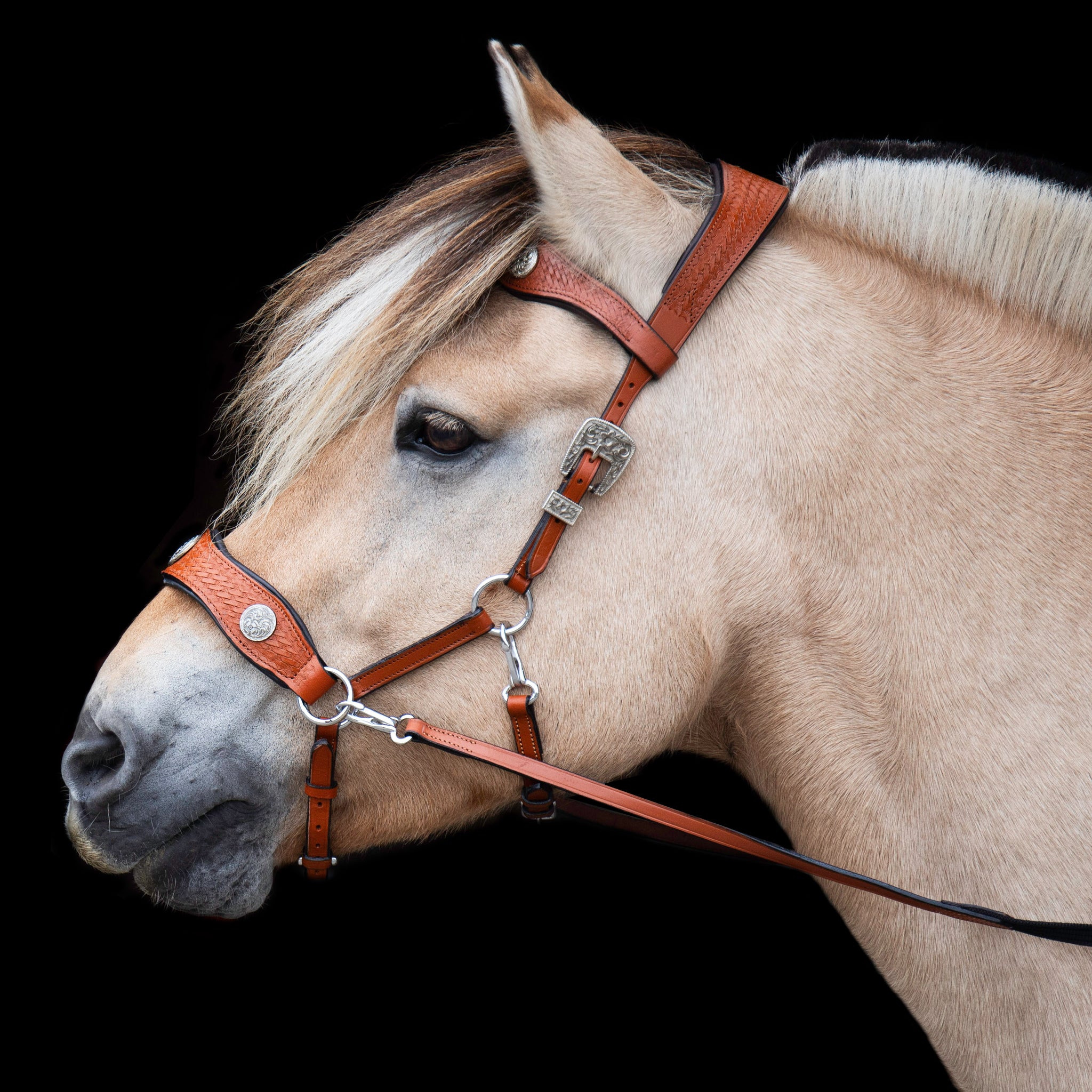 • Western conchos and statement buckle for show-worthy stylGentle, bitless pressure for a relaxed, balanced frame